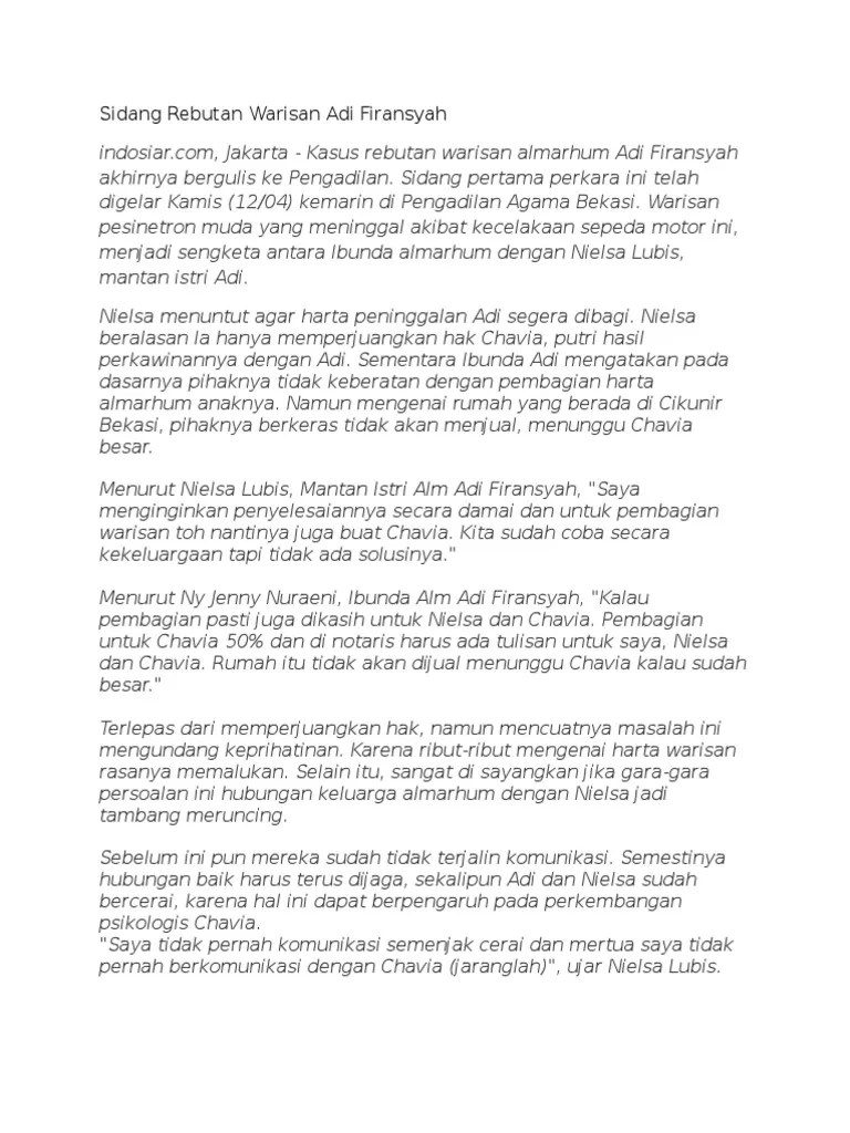 Hukum waris yang berlaku di indonesia ada tiga yakni: Sengketa harta warisan antara para ahli waris yang berbeda agama. Hak waris janda tanpa anak atas harta bawaan suami ditinjau dari kitab undang undang hukum perdata (studi kasus terhadap putusan nomor . Contoh kasus sidang rebutan warisan adi firansyah 6 masalah hukum keluarga dan hukum perdata kasus rebutan warisan almarhum adi firansyah. Perspektif hukum perdata (studi kasus pengadilan negeri sragen).