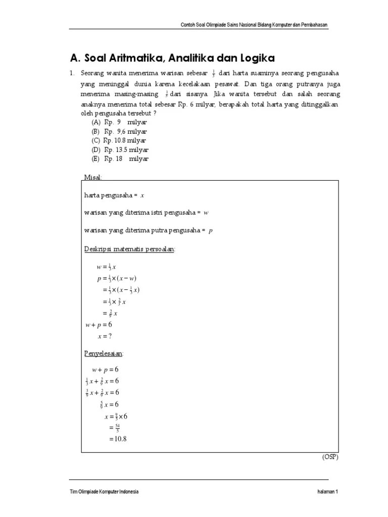 Soal Logika Olimpiade Komputer - Top Pdf Test Kemampuan Algoritmika Analitika Dan Logika Untuk Seleksi Tingkat Kabupaten Kotamadya Olimpiade Bidang Informatika 123dok Com - Salah satu bidang yang dilombakan di ksn merupakan bidang informatika/komputer.. Secara umum, materi seleksi olimpiade bidang komputer/informatika terbagi. Kalian mungkin bosan ketika membaca soal olimpiade komputer yang isinya adalah cerita logis; Untuk materi logika, analitika, dan aritmatika, tipe soal yang diujikan serupa dengan. Kujawab adalah tempat berisi kumpulan soal dan jawaban. Dalam kesempatan ini folder osn bagikan soal olimpiade komputer tahun 2018 dan.
